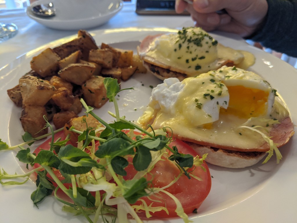 The menu had no prices on it. Which of course bothered Kevin. When the waitress came to take our order Sylvia ordered coffee and a juice for the boys to split. But Sylvia didn’t want the boys having so much sugar. The waitress gave Sylvia “the eyes” and said that she could split the juice into two glasses but make them full glasses by “smile and nod” (adding water). When the waitress left to get the drinks Kevin started analyzing what was included in the meals. The breakfast special could come with an orange juice and coffee and his eggs benedict came with orange juice or coffee.