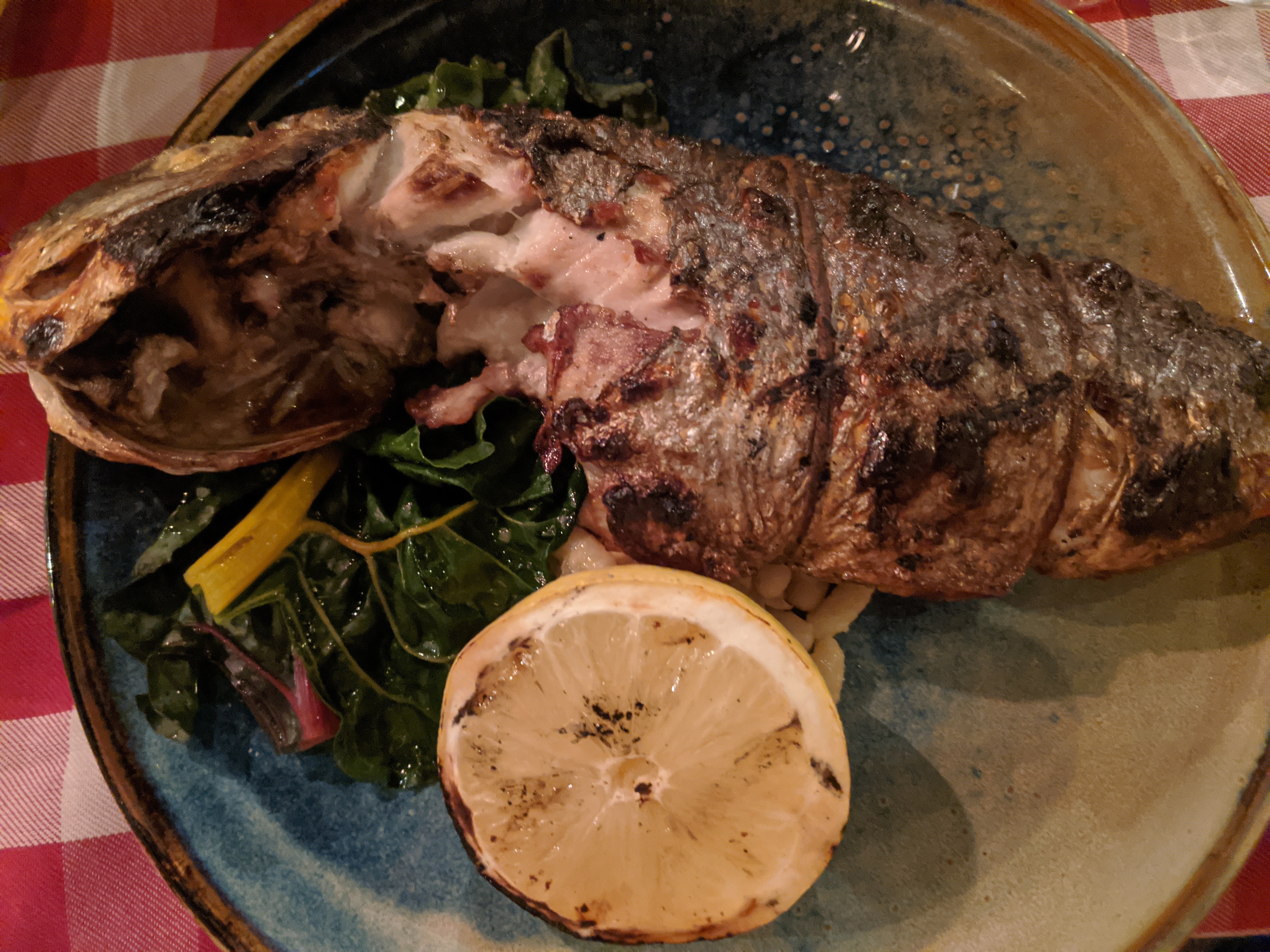 The whole grilled fish is done directly on an open flame grill and stuffed with onions and lemon slices. This picture was not the best and does not do it justice at all. The fish was juicy and not over done, and the white bean pasta was a perfect complement. Sylvia normally doesn’t like chard but this was young leaves and very tender.