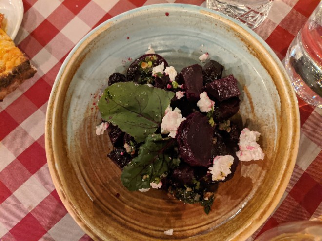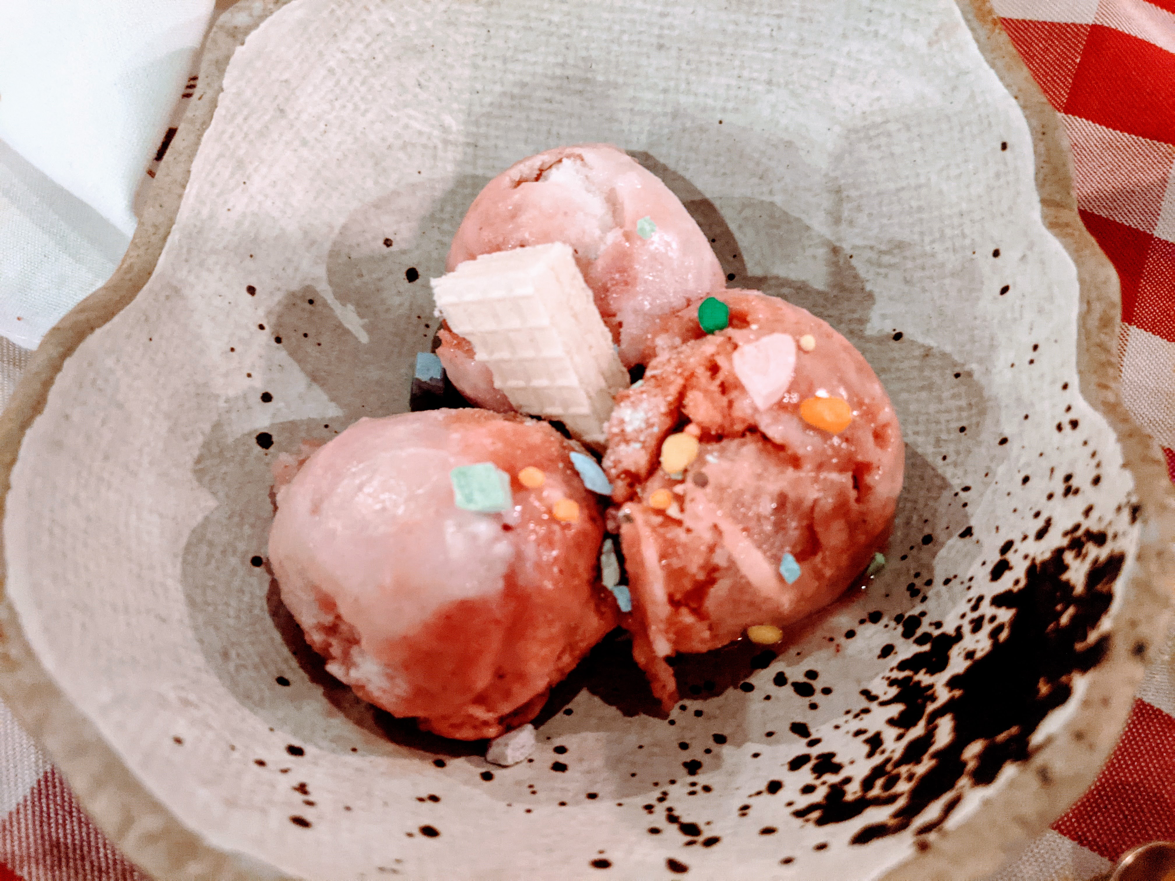 KEvin: The fried gnocchi side dish with sage and brown butter is slightly crunchy on the outside and comes in a very unique flavor profile. We tried figuring out what it was but couldn’t.