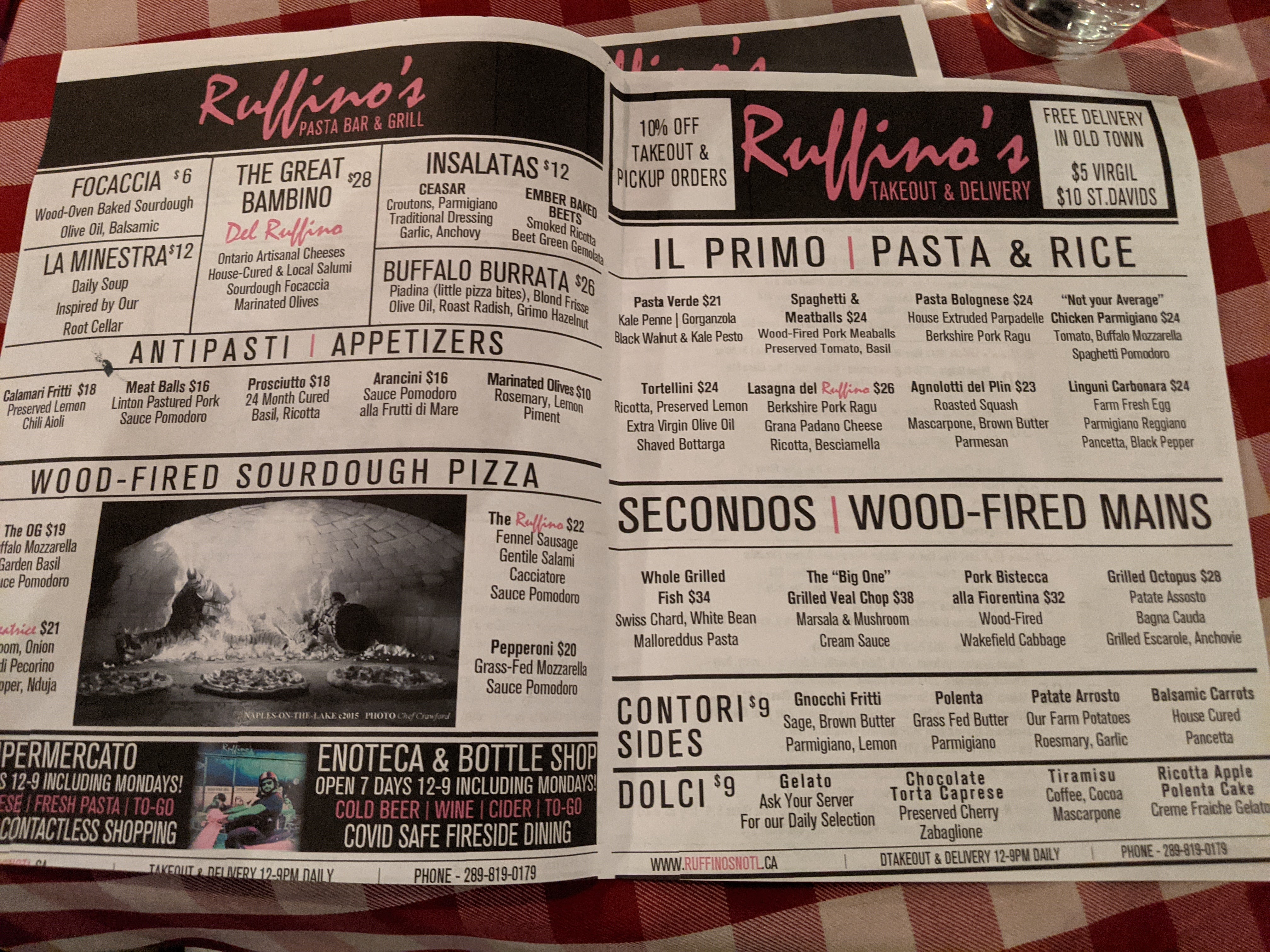 The year of 2020 will be known for many things. While it was a tough year with COVID, it was also the year we discovered and fell in love with Ruffino’s in Niagara-On-The-Lake (NOTL). This Italian restaurant sits in a plain corner strip mall but its food is top notch. T-shirts worn by the servers denote the place as “Naples On The Lake”, and we quite agree. The atmosphere is is a mix of Italian trattoria with modern Niagara, complete with red and white checkered table cloths and and wine barrels as side tables on the patio.
