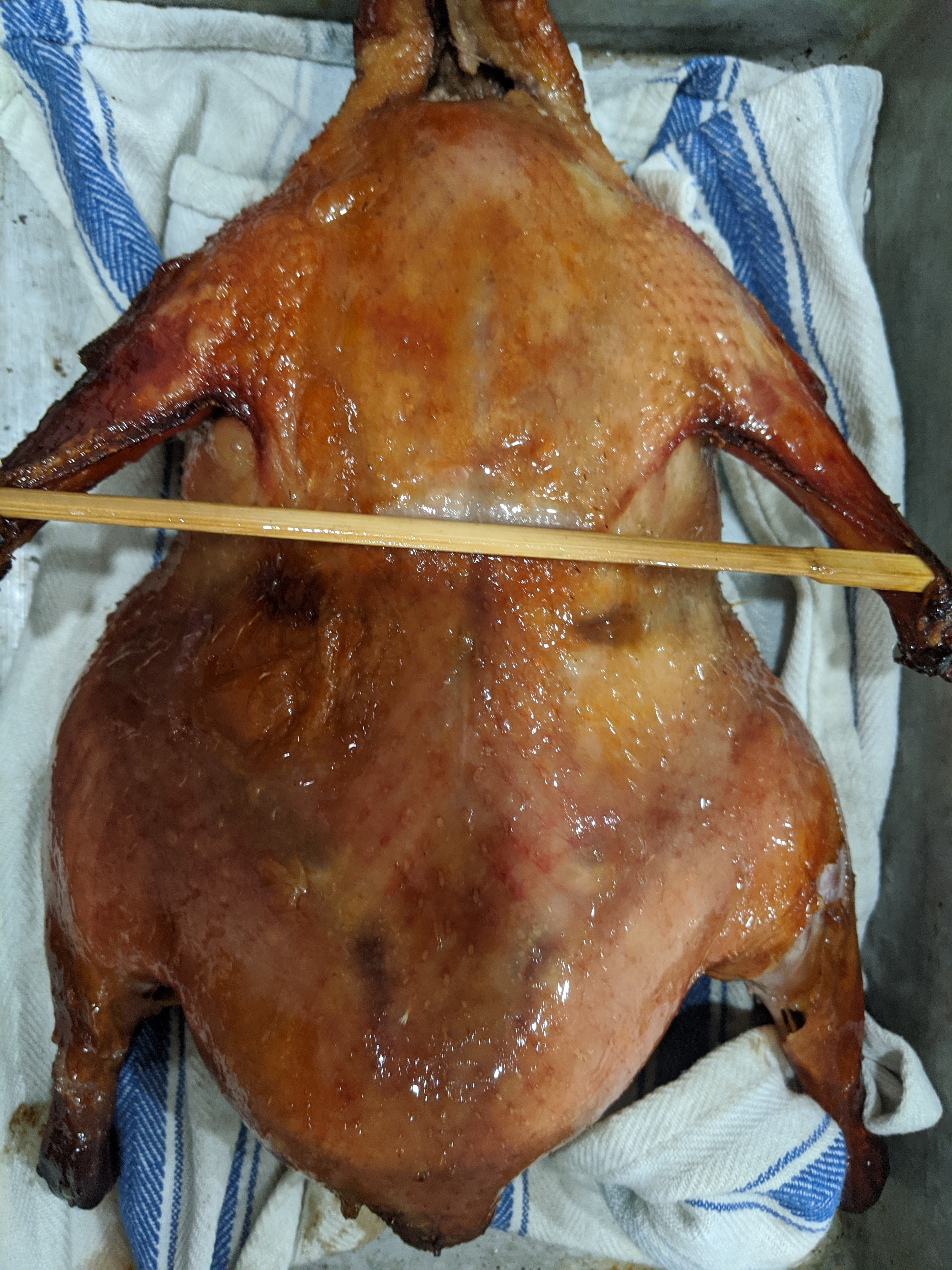[Daddy]The first step is basically to blanch the duck with a seasoned water. The seasoning has Chinese five spice in it. actually that’s not the first step the first step is to stuff the bird with hoisin sauce and a mixture of Chinese five spice then you seal the cavity of the duck with a bamboo skewer. Then you do the blanching of the duck. After the duck is blanched you have to coat it with maltos syrup I do this with a brush. After that you basically just have to let the duck sit and dry out for a long time. Actually that’s not true I miss the step you have to separate the skin of the duck from the meat you actually should do that at the very beginning I forgot to mention that this makes sure that when the duck ends up getting cooked the skin will stay crispy and not get softened by the oils of and juices of the duck. After the duck has dried for three days you smoke it with some apple Woods smoke. Then you roast it I’ve been doing it in our smoker but you can do it in the oven. Once it’s done baking you have to blanch it again with hot oil this gets the skin nice and crispy then you’ve got to cut the skin off before it gets soft from the juice.