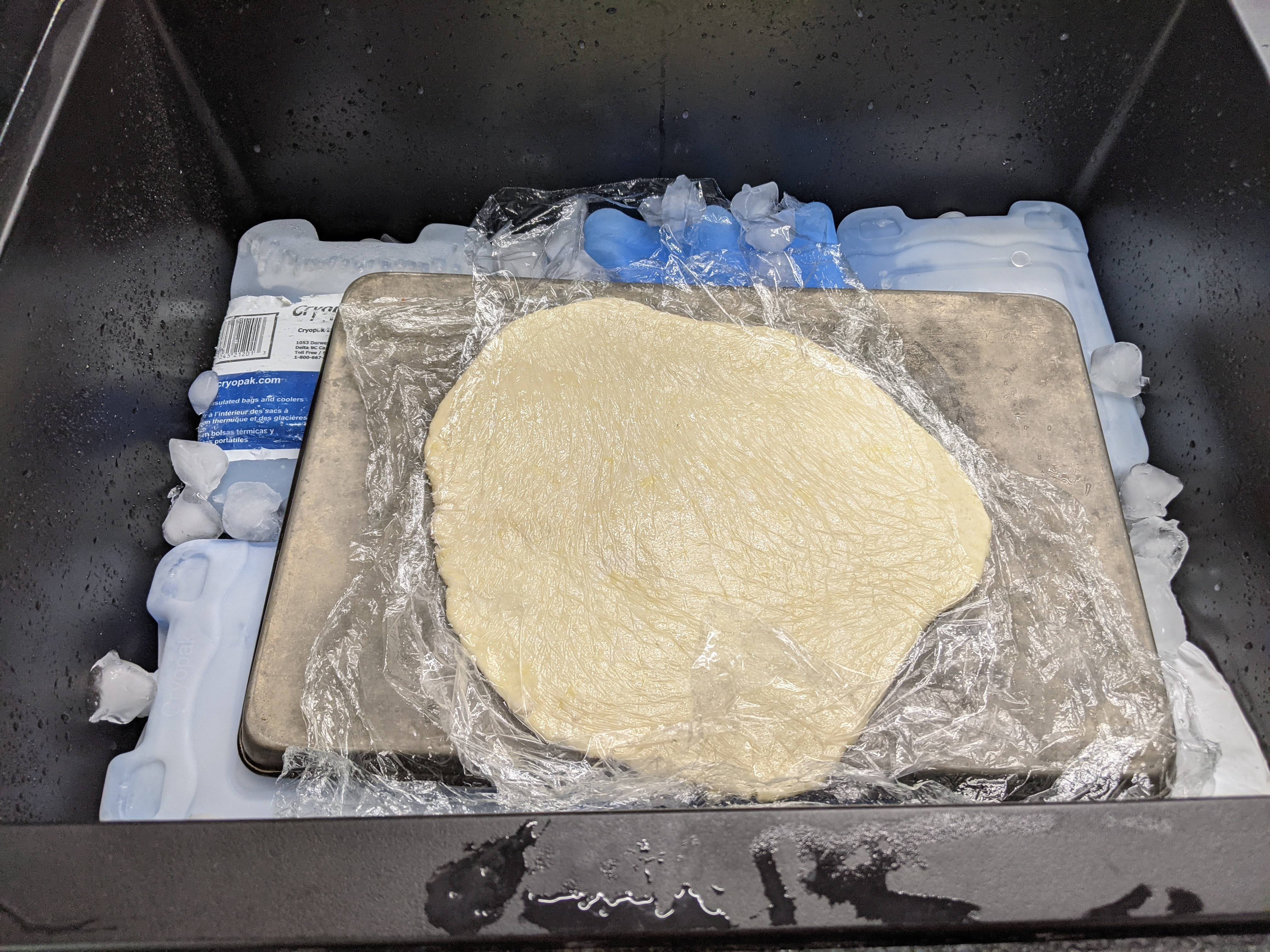 In the video in the recipe, the dough looks like it is getting rolled out on one of those professional metal countertops that can be cooled. It seems like you can cool a stone counter-top for a similar effect, but with my obsession with keeping it cool, I decided to roll on top of a large baking tray that I would keep cool in my sink with ice and ice packs. Like this.