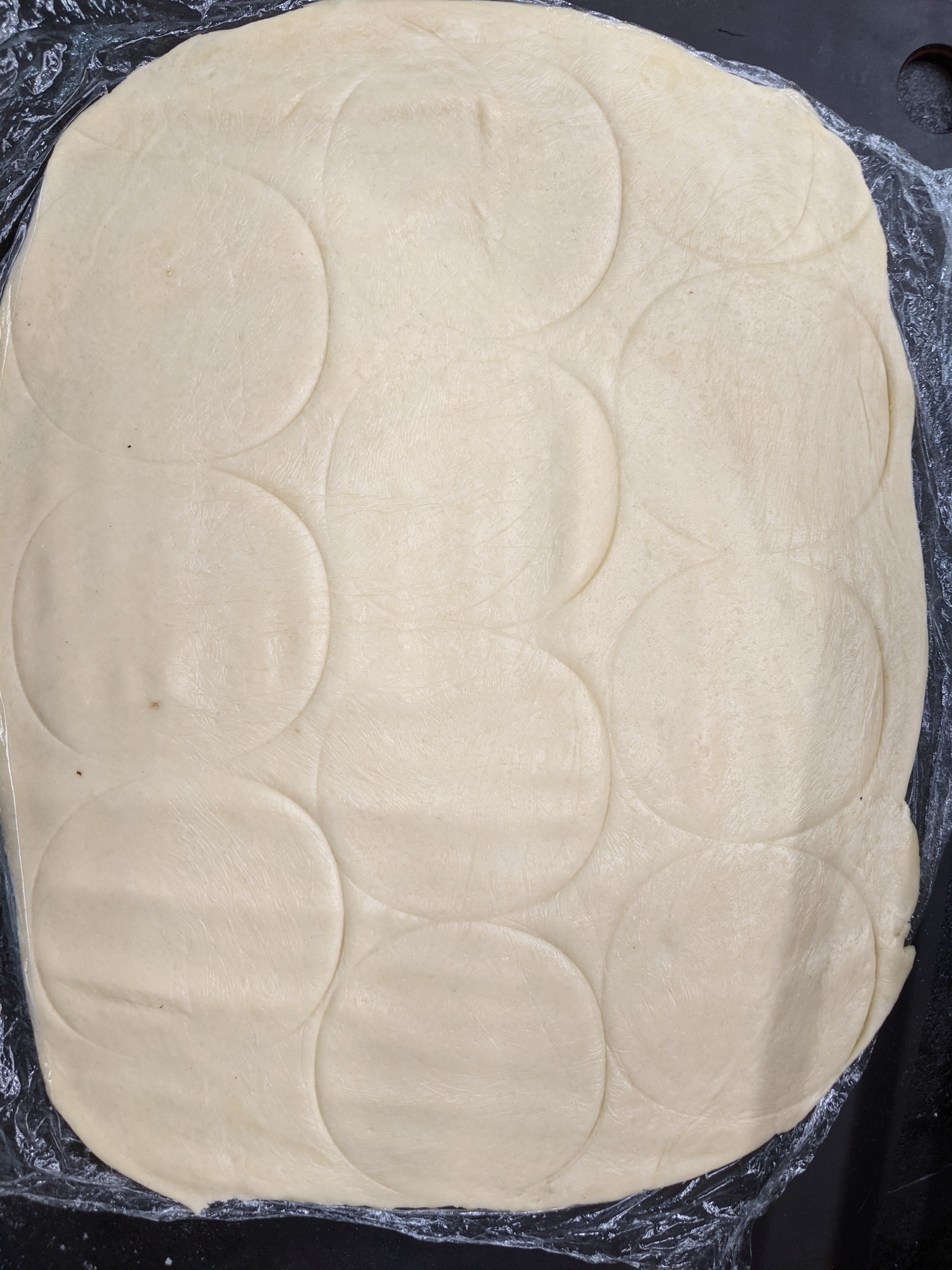 One suggestion that I would add to the recipe is that you should try to plan ahead how you are going to cut out all of your circles for the tarts. I realized a bit late in the game that if I didn’t get the dough into the right shape I wouldn’t be able to fit in enough circles. I reduced my expected number of tarts down a bit because I had taken out half of the oil dough which made things more challenging but I still managed to get 12. After cutting them out in the shape below using a rolling dough cutting tool that Syl got me for Christmas, I folded up the leftover dough and flattened another piece of dough to roll two more circles. It seems I made the dough thin enough that I could do this. I wasn’t sure how they would turn out but they were indistinguishable from the others actually.