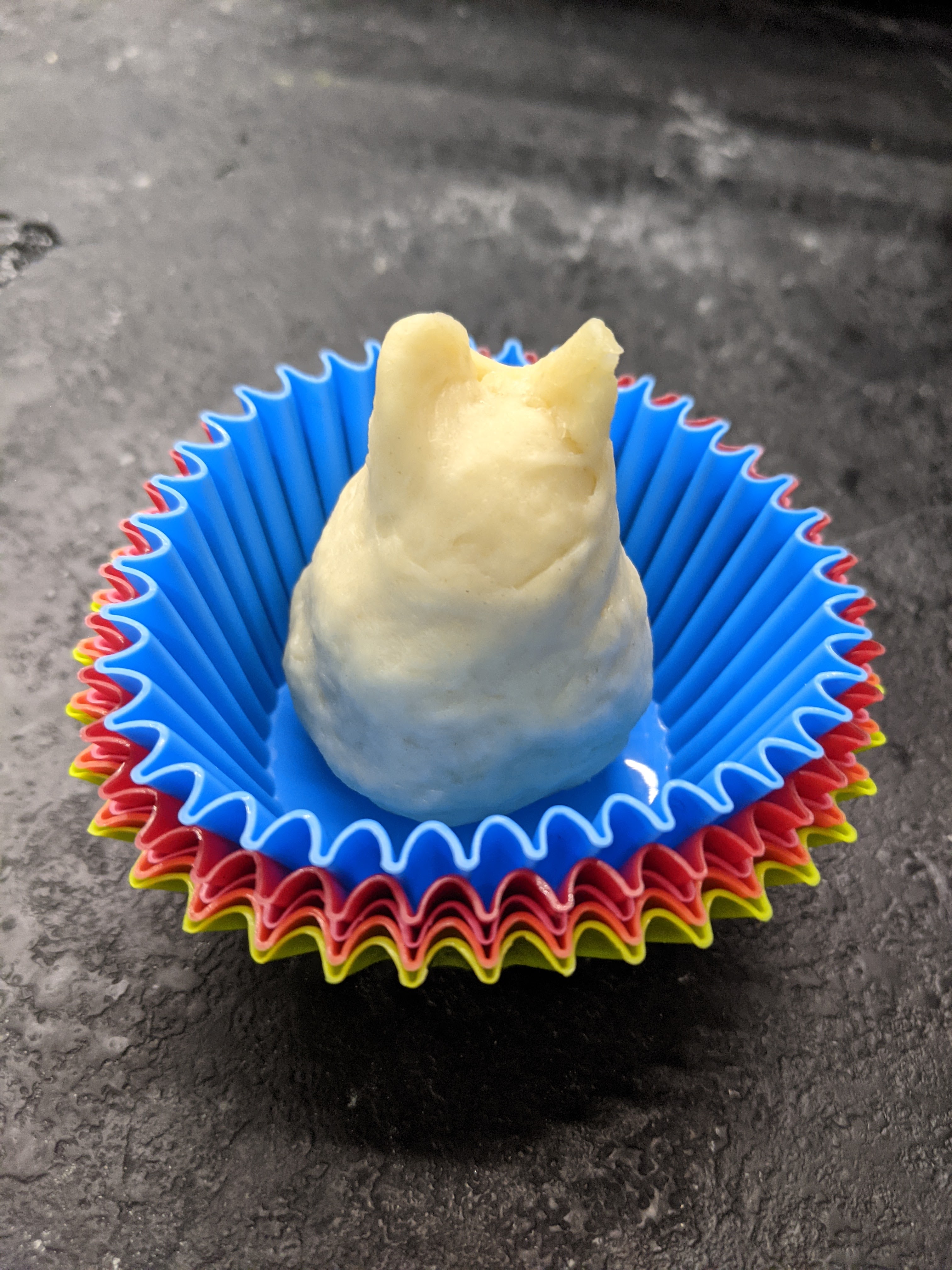 I didn’t have 12 little tart molds, so I used a muffin tin. They turned out fine so I don’t think you need the tart molds if you are just eating these at home. As I prepared to stick the filled tarts into the oven, Syl breezed by and said that we had to add black sesame to some of them because she’d heard about this, but it’s rare and it sounds delicious. So she busted out her bag of black sesame and stirred some into a couple of the egg tart fillings as a last minute experiment. What could possibly go wrong with butter, egg, and black sesame? Nothing! She also lent her hand to the extra dough and made a puff pastry Totoro*. Because who wouldn’t want that too?