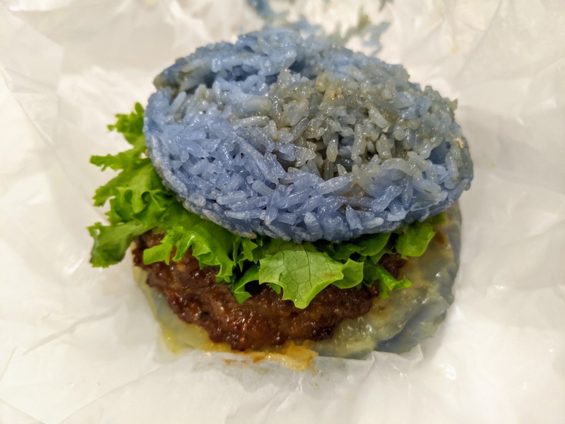 The Sticky Piggy “burger” was a surprising blue colour! Truly on brand. The sticky rice stuck to the paper and was very hard to pick up to eat; if you ever order this we recommend that you have napkins and a fork on hand. The wrapping isn’t done in a way that allows you eat it out of the wrapping. But… that’s the only thing we can complain about regarding this burger. It was very tasty. The meat was seasoned well and the cheese balanced with the rest of the ingredients. The sticky rice was chewy and overall it felt like a Thai bowl in sandwich form.